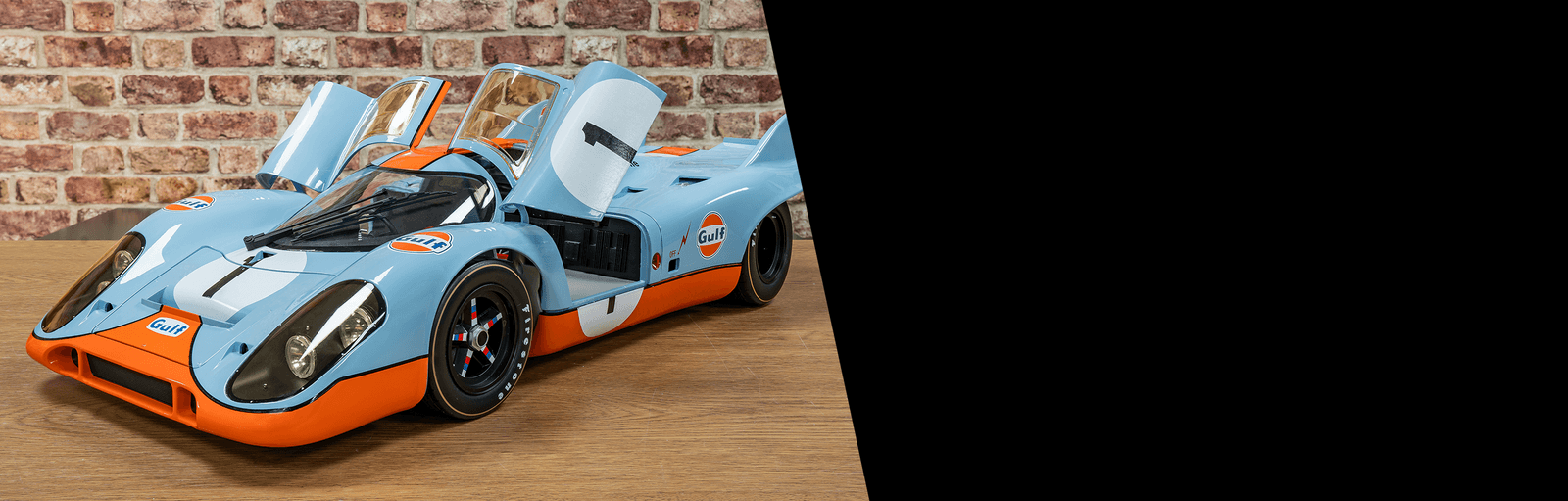 This model represents the 1971 Gulf-liveried 917K raced by British motorsport legend Derek Bell and Swiss driver Jo Siffert at the 1000km Monza, where it placed second behind its sister Porsche 917K.
